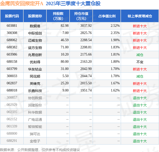金鹰民安回报定开A的前十大重仓股如下: