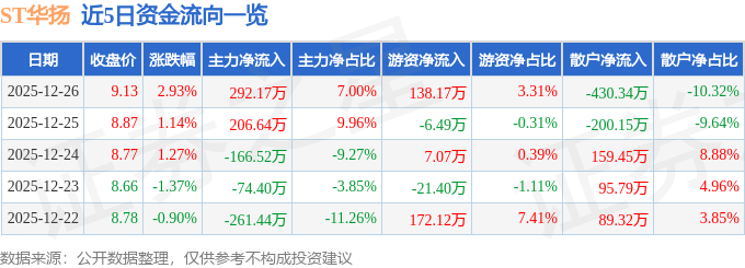 证券之星消息,截至2025年12月26日收盘,ST华扬(603825)报收于9.13元,上涨2.93%,换手率1.81%,成交量4.59万手,成交额4171.15万元。