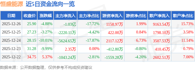 证券之星消息,截至2025年12月26日收盘,恒盛能源(605580)报收于25.9元,下跌4.88%,换手率7.86%,成交量22.0万手,成交额5.83亿元。