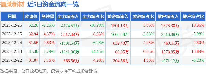 证券之星消息,截至2025年12月26日收盘,福莱新材(605488)报收于32.2元,下跌2.25%,换手率2.82%,成交量7.79万手,成交额2.53亿元。