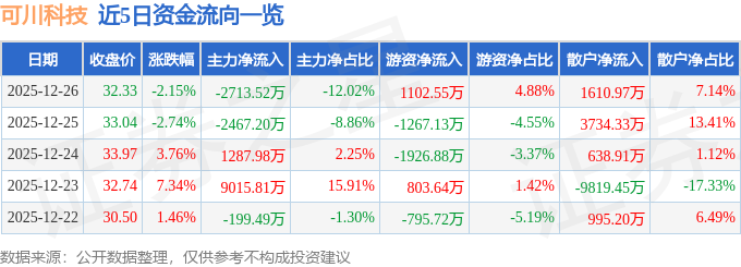 证券之星消息,截至2025年12月26日收盘,可川科技(603052)报收于32.33元,下跌2.15%,换手率3.72%,成交量6.98万手,成交额2.26亿元。