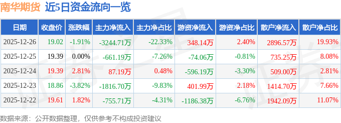 证券之星消息,截至2025年12月26日收盘,南华期货(603093)报收于19.02元,下跌1.91%,换手率1.24%,成交量7.55万手,成交额1.45亿元。