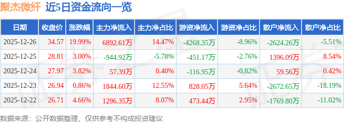 证券之星消息,截至2025年12月26日收盘,聚杰微纤(300819)报收于34.57元,上涨19.99%,涨停,换手率10.68%,成交量14.39万手,成交额4.76亿元。