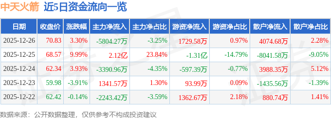 证券之星消息,截至2025年12月26日收盘,中天火箭(003009)报收于70.83元,上涨3.3%,换手率16.21%,成交量25.19万手,成交额17.87亿元。