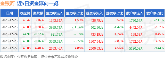 证券之星消息,截至2025年12月26日收盘,金银河(300619)报收于46.42元,上涨3.16%,换手率12.5%,成交量18.18万手,成交额8.44亿元。