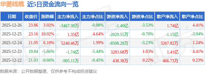 证券之星消息,截至2025年12月26日收盘,华菱线缆(001208)报收于23.86元,上涨3.02%,换手率62.13%,成交量163.65万手,成交额39.5亿元。