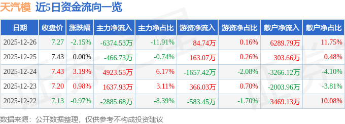 证券之星消息,截至2025年12月26日收盘,天汽模(002510)报收于7.27元,下跌2.15%,换手率7.3%,成交量73.35万手,成交额5.35亿元。