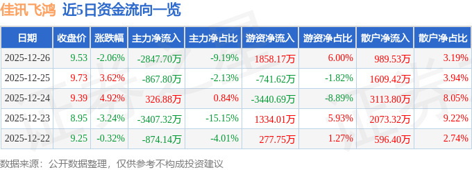 证券之星消息,截至2025年12月26日收盘,佳讯飞鸿(300213)报收于9.53元,下跌2.06%,换手率5.88%,成交量32.46万手,成交额3.1亿元。
