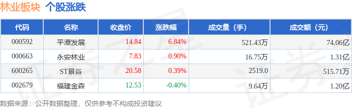 证券之星消息,12月26日林业板块较上一交易日上涨5.32%,平潭发展领涨。当日上证指数报收于3963.68,上涨0.1%。深证成指报收于13603.89,上涨0.54%。林业板块个股涨跌见下表: