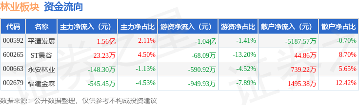 从资金流向上来看,当日林业板块主力资金净流入1.5亿元,游资资金净流出1.2亿元,散户资金净流出2908.1万元。林业板块个股资金流向见下表: