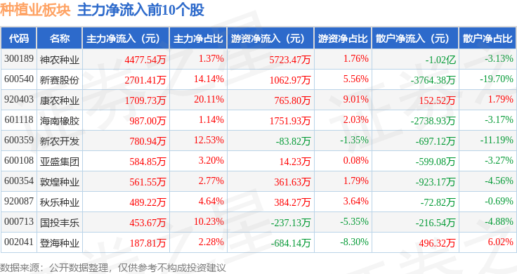 从资金流向上来看,当日种植业板块主力资金净流入219.32万元,游资资金净流入8230.91万元,散户资金净流出8450.22万元。种植业板块个股资金流向见下表: