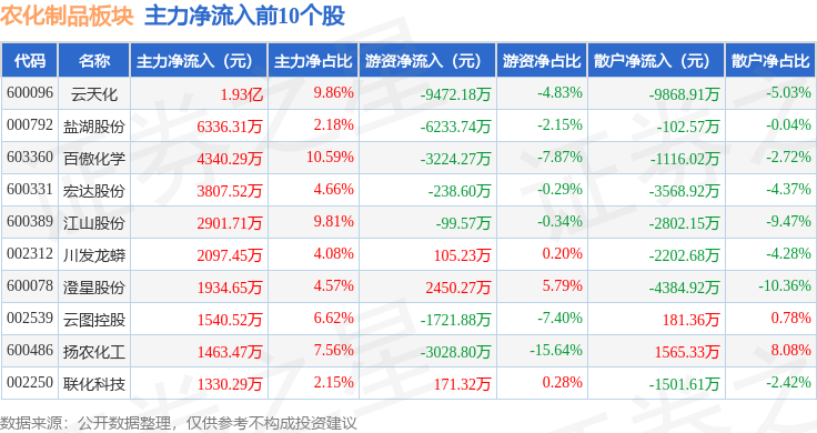 从资金流向上来看,当日农化制品板块主力资金净流入1.2亿元,游资资金净流出3.29亿元,散户资金净流入2.09亿元。农化制品板块个股资金流向见下表: