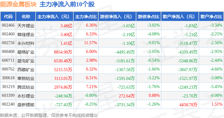从资金流向上来看,当日能源金属板块主力资金净流入9.52亿元,游资资金净流出5.84亿元,散户资金净流出3.68亿元。能源金属板块个股资金流向见下表:
