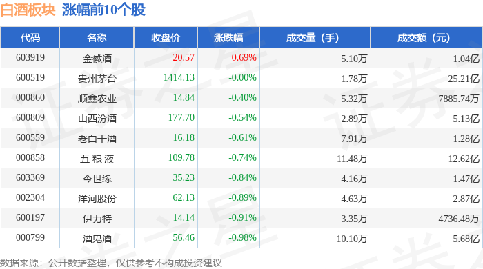 证券之星消息,12月26日白酒板块较上一交易日下跌0.34%,*ST岩石领跌。当日上证指数报收于3963.68,上涨0.1%。深证成指报收于13603.89,上涨0.54%。白酒板块个股涨跌见下表: