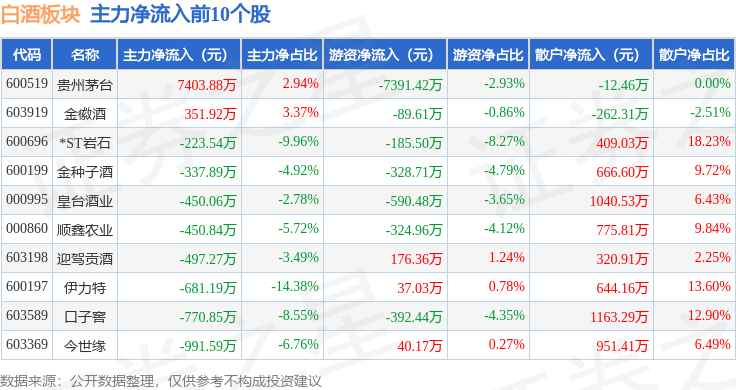 从资金流向上来看,当日白酒板块主力资金净流出4.94亿元,游资资金净流入4769.05万元,散户资金净流入4.46亿元。白酒板块个股资金流向见下表: