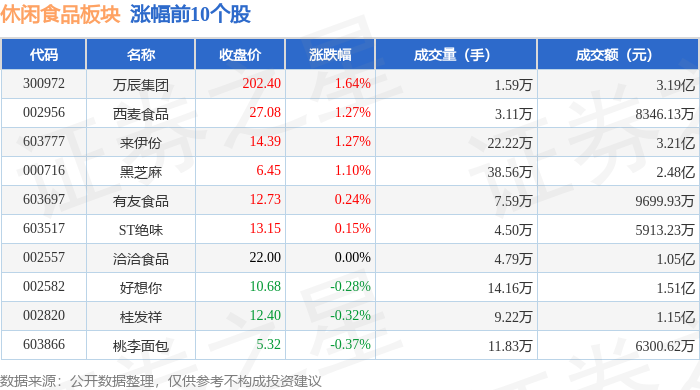证券之星消息,12月26日休闲食品板块较上一交易日上涨0.02%,万辰集团领涨。当日上证指数报收于3963.68,上涨0.1%。深证成指报收于13603.89,上涨0.54%。休闲食品板块个股涨跌见下表: