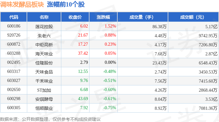 从资金流向上来看,当日调味发酵品板块主力资金净流出2921.81万元,游资资金净流入2463.7万元,散户资金净流入458.11万元。调味发酵品板块个股资金流向见下表: