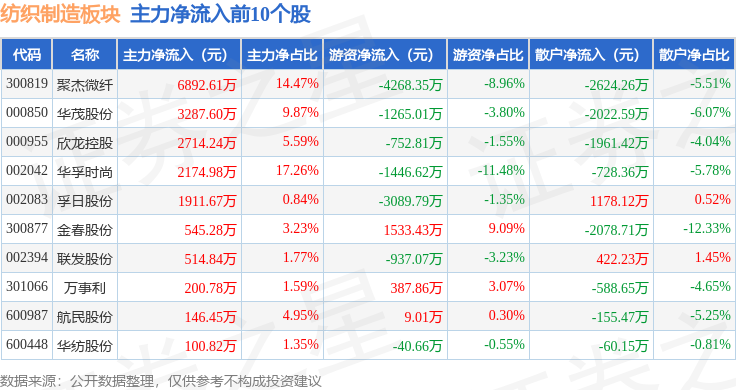 从资金流向上来看,当日纺织制造板块主力资金净流入1208.62万元,游资资金净流出6451.61万元,散户资金净流入5243.0万元。纺织制造板块个股资金流向见下表: