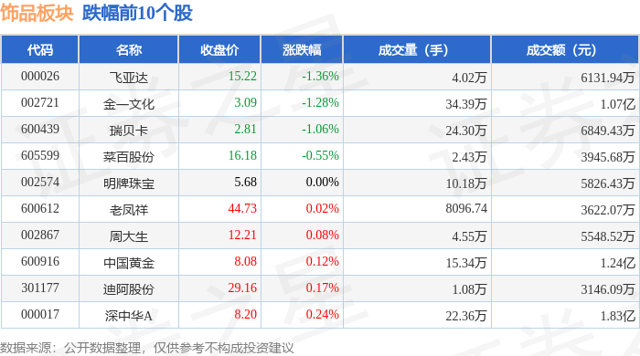 证券之星消息,12月26日饰品板块较上一交易日下跌0.01%,飞亚达领跌。当日上证指数报收于3963.68,上涨0.1%。深证成指报收于13603.89,上涨0.54%。饰品板块个股涨跌见下表: