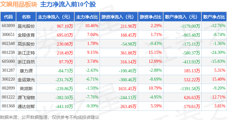 从资金流向上来看,当日文娱用品板块主力资金净流出2.0亿元,游资资金净流入3051.91万元,散户资金净流入1.69亿元。文娱用品板块个股资金流向见下表: