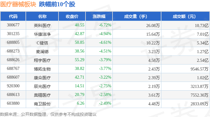 证券之星消息,12月26日医疗器械板块较上一交易日下跌0.54%,英科医疗领跌。当日上证指数报收于3963.68,上涨0.1%。深证成指报收于13603.89,上涨0.54%。医疗器械板块个股涨跌见下表: