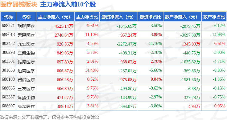 从资金流向上来看,当日医疗器械板块主力资金净流出6.29亿元,游资资金净流入1.66亿元,散户资金净流入4.63亿元。医疗器械板块个股资金流向见下表: