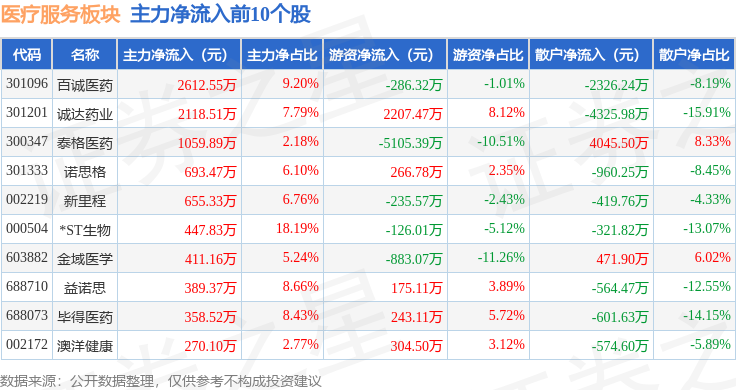 从资金流向上来看,当日医疗服务板块主力资金净流出8.24亿元,游资资金净流入4129.99万元,散户资金净流入7.83亿元。医疗服务板块个股资金流向见下表:
