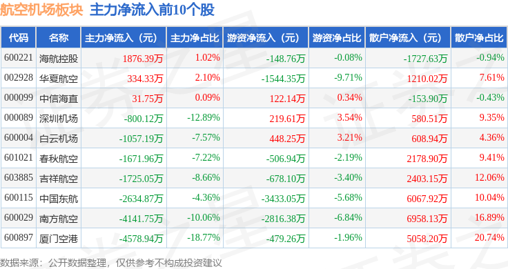从资金流向上来看,当日航空机场板块主力资金净流出3.13亿元,游资资金净流出2717.44万元,散户资金净流入3.4亿元。航空机场板块个股资金流向见下表: