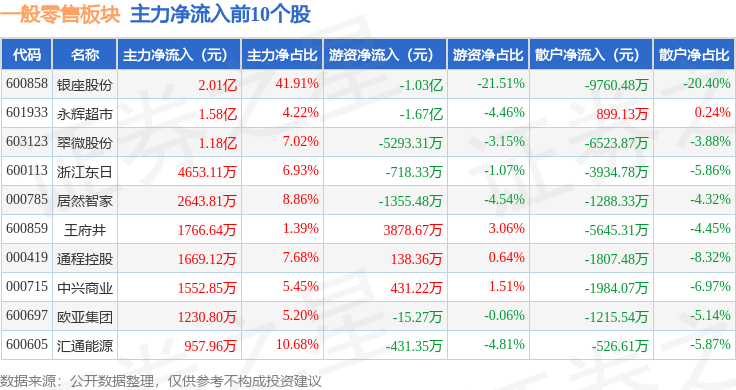 从资金流向上来看,当日一般零售板块主力资金净流出8.91亿元,游资资金净流出6848.45万元,散户资金净流入9.59亿元。一般零售板块个股资金流向见下表: