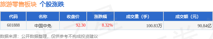 证券之星消息,12月26日旅游零售板块较上一交易日上涨8.32%,中国中免领涨。当日上证指数报收于3963.68,上涨0.1%。深证成指报收于13603.89,上涨0.54%。旅游零售板块个股涨跌见下表: