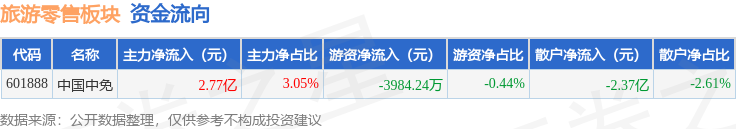 从资金流向上来看,当日旅游零售板块主力资金净流入2.77亿元,游资资金净流出3984.24万元,散户资金净流出2.37亿元。旅游零售板块个股资金流向见下表: