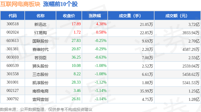 证券之星消息,12月26日互联网电商板块较上一交易日下跌0.88%,星徽股份领跌。当日上证指数报收于3963.68,上涨0.1%。深证成指报收于13603.89,上涨0.54%。互联网电商板块个股涨跌见下表:
