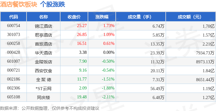 证券之星消息,12月26日酒店餐饮板块较上一交易日上涨0.47%,锦江酒店领涨。当日上证指数报收于3963.68,上涨0.1%。深证成指报收于13603.89,上涨0.54%。酒店餐饮板块个股涨跌见下表: