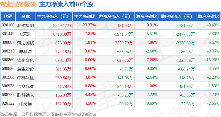 从资金流向上来看,当日专业服务板块主力资金净流入2140.65万元,游资资金净流出5395.44万元,散户资金净流入3254.8万元。专业服务板块个股资金流向见下表: