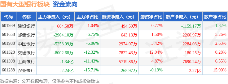 从资金流向上来看,当日国有大型银行板块主力资金净流出5.13亿元,游资资金净流入1.74亿元,散户资金净流入3.39亿元。国有大型银行板块个股资金流向见下表: