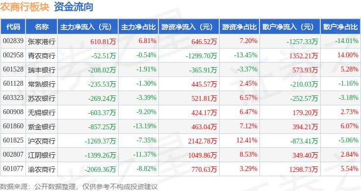 从资金流向上来看,当日农商行板块主力资金净流出6353.1万元,游资资金净流入4798.77万元,散户资金净流入1554.33万元。农商行板块个股资金流向见下表: