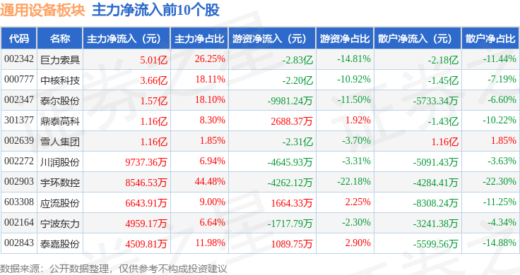 从资金流向上来看,当日通用设备板块主力资金净流出17.79亿元,游资资金净流出6.82亿元,散户资金净流入24.61亿元。通用设备板块个股资金流向见下表: