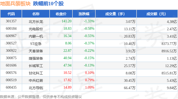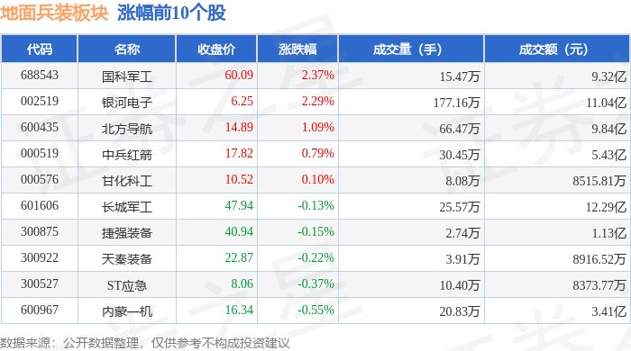 证券之星消息,12月26日地面兵装板块较上一交易日上涨0.27%,国科军工领涨。当日上证指数报收于3963.68,上涨0.1%。深证成指报收于13603.89,上涨0.54%。地面兵装板块个股涨跌见下表: