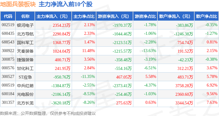 从资金流向上来看,当日地面兵装板块主力资金净流出1.21亿元,游资资金净流出9145.36万元,散户资金净流入2.12亿元。地面兵装板块个股资金流向见下表: