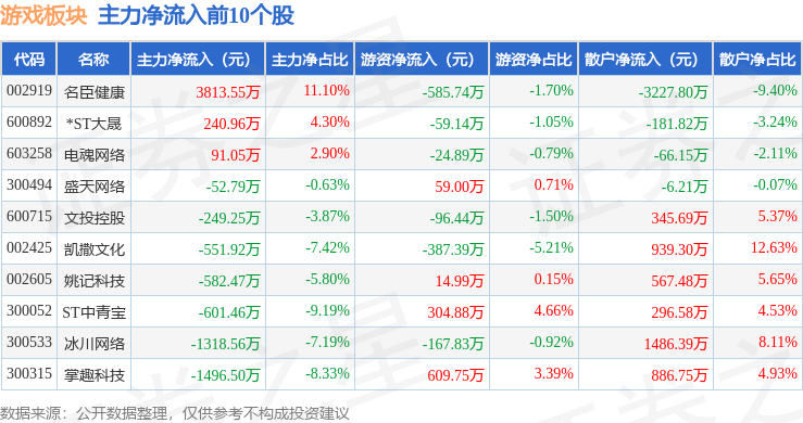 从资金流向上来看,当日游戏板块主力资金净流出10.05亿元,游资资金净流入3.73亿元,散户资金净流入6.32亿元。游戏板块个股资金流向见下表: