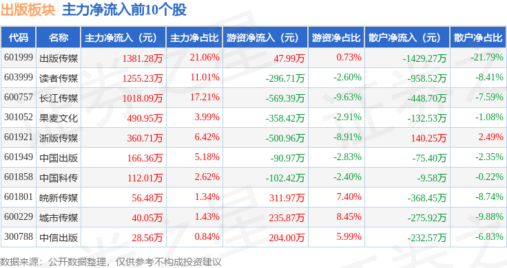 从资金流向上来看,当日出版板块主力资金净流出6926.69万元,游资资金净流出1557.81万元,散户资金净流入8484.5万元。出版板块个股资金流向见下表: