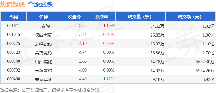 证券之星消息,12月26日焦炭板块较上一交易日上涨0.17%,宝泰隆领涨。当日上证指数报收于3963.68,上涨0.1%。深证成指报收于13603.89,上涨0.54%。焦炭板块个股涨跌见下表: