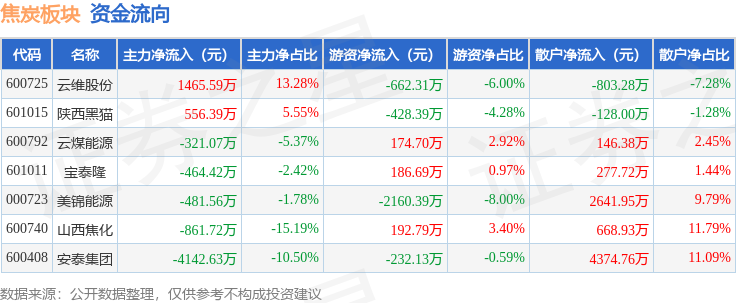 从资金流向上来看,当日焦炭板块主力资金净流出4249.42万元,游资资金净流出2929.04万元,散户资金净流入7178.46万元。焦炭板块个股资金流向见下表: