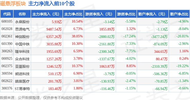 从资金流向上来看,当日磁悬浮板块主力资金净流入430.56万元,游资资金净流出3.76亿元,散户资金净流入3.71亿元。磁悬浮板块个股资金流向见下表: