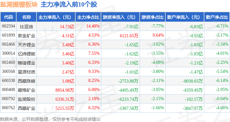 从资金流向上来看,当日盐湖提锂板块主力资金净流入33.63亿元,游资资金净流出15.53亿元,散户资金净流出18.1亿元。盐湖提锂板块个股资金流向见下表: