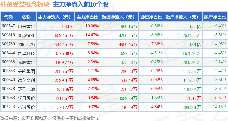 从资金流向上来看,当日外贸受益概念板块主力资金净流出9.87亿元,游资资金净流入4.85亿元,散户资金净流入5.01亿元。外贸受益概念板块个股资金流向见下表: