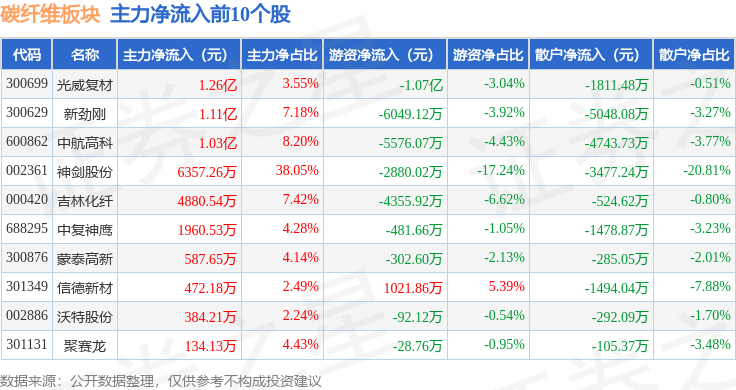 从资金流向上来看,当日碳纤维板块主力资金净流出8.91亿元,游资资金净流出2.31亿元,散户资金净流入11.22亿元。碳纤维板块个股资金流向见下表: