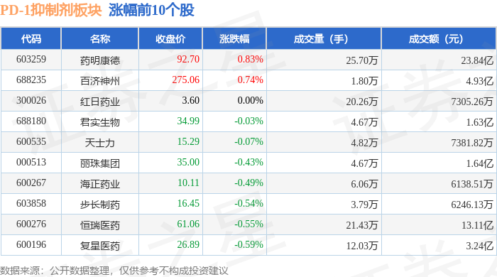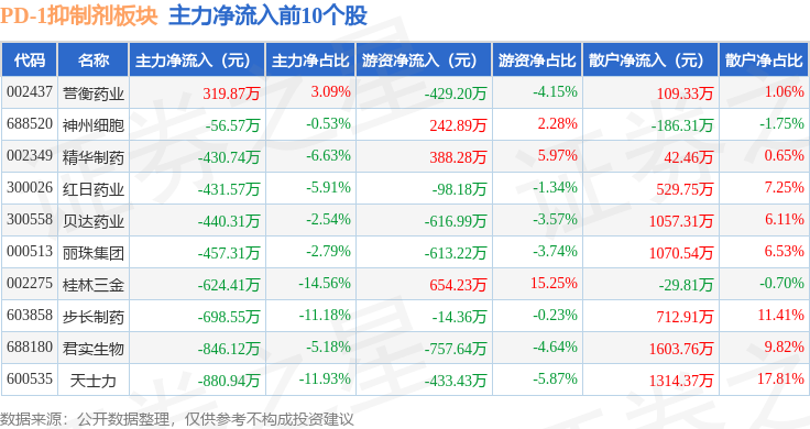 从资金流向上来看,当日PD-1抑制剂板块主力资金净流出5.61亿元,游资资金净流入1.23亿元,散户资金净流入4.37亿元。PD-1抑制剂板块个股资金流向见下表: