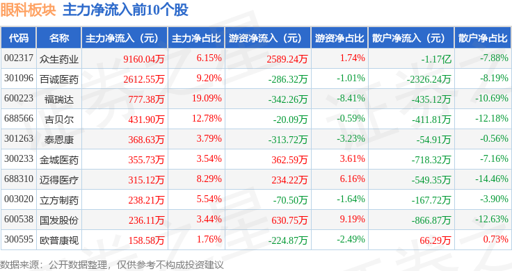从资金流向上来看,当日眼科板块主力资金净流出5.01亿元,游资资金净流入5270.83万元,散户资金净流入4.48亿元。眼科板块个股资金流向见下表: