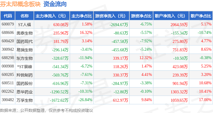 从资金流向上来看,当日芬太尼概念板块主力资金净流出4268.19万元,游资资金净流出2585.56万元,散户资金净流入6853.76万元。芬太尼概念板块个股资金流向见下表: